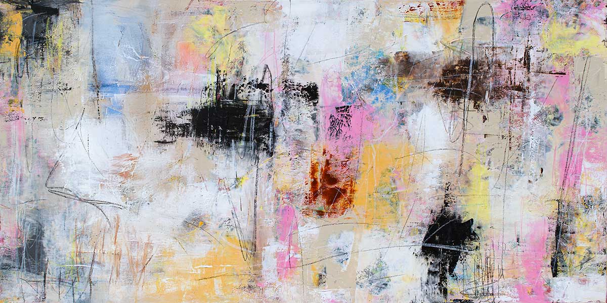 Farvepaletten bevæger sig mellem sart pudderrosa, støvet flamingo og lys fersken, som balanceres af gylden okker og dæmpet honninggul. Indimellem brydes fladen af kølige toner i dueblå og svag lavendel, mens enkelte felter i rustrød og brændt sienna tilfører dybde. De sorte partier – nogle kompakte, andre mere skrabede – ligger som visuelle ankre i kompositionen og giver struktur til de mere transparente områder.