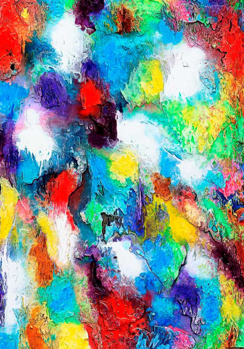Lærredstryk med stærke farver er opbygget som et tæt og energifyldt motiv, hvor mættede farvefelter og flydende overgange skaber en næsten eksplosiv bevægelse gennem hele billedfladen. Kompositionen er ikke bundet op på én fast struktur, men folder sig ud i et pulserende samspil mellem farvemættede skyer, tætte pigmentfelter og mere transparente overgange. Store områder i turkis og akvamarin breder sig gennem midten, mens røde, violette og citronlyse felter bryder frem omkring dem. Der er en organisk karakter i motivet, som kan lede tankerne hen på blomsterformer, smeltede mineraler eller et abstrakt landskab set helt tæt på.