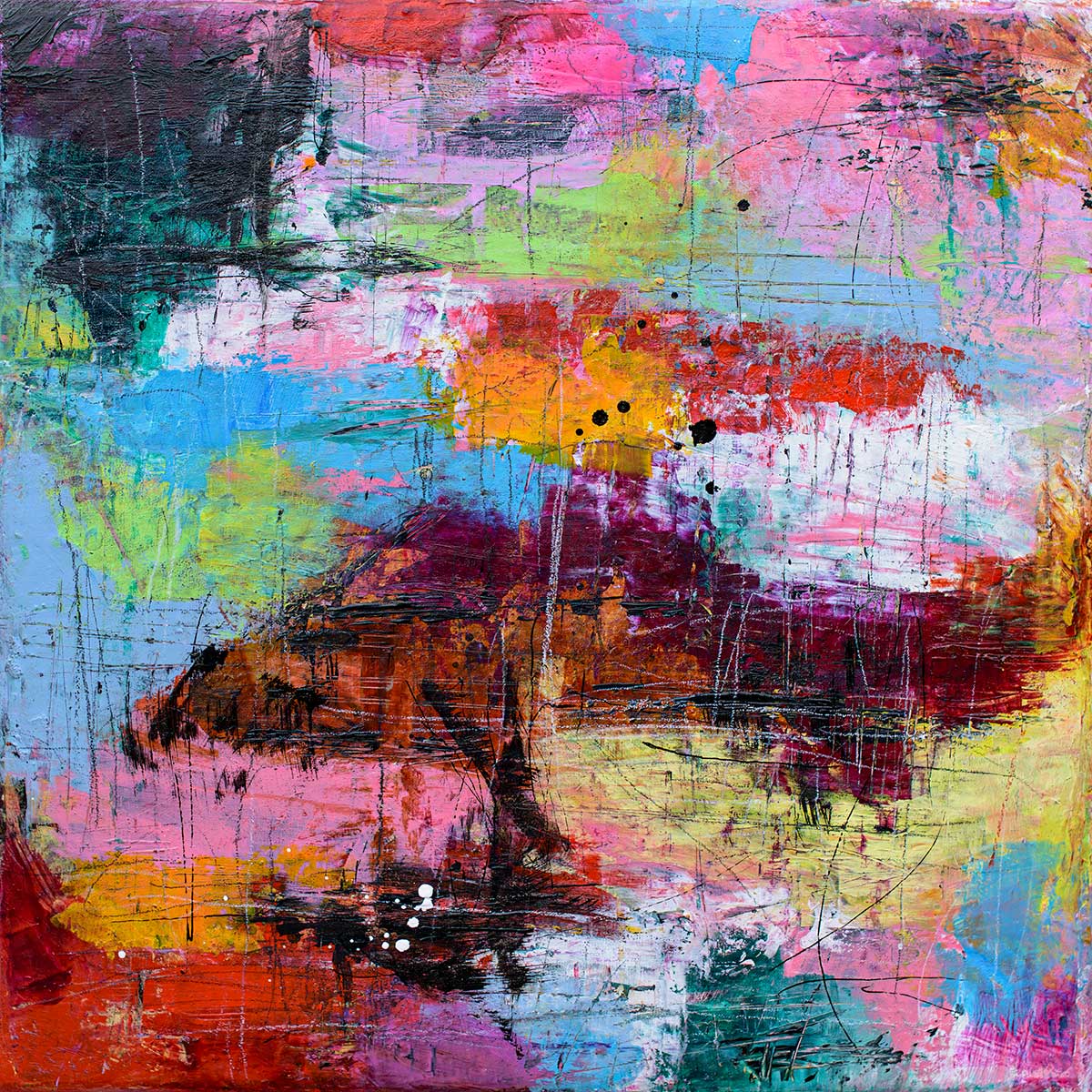 Lille maleri farverigt har et stærkt og åbent udtryk, hvor klare farver, mørke aftegninger og fine lineære spor samles i en komposition med høj energi. Det første indtryk er levende og intenst, men billedet virker ikke uroligt, fordi de mørkere områder og de lyse overgange holder motivet samlet. På afstand står værket som et tydeligt fokuspunkt, mens de mange små spor i overfladen gør det mere komplekst tæt på.