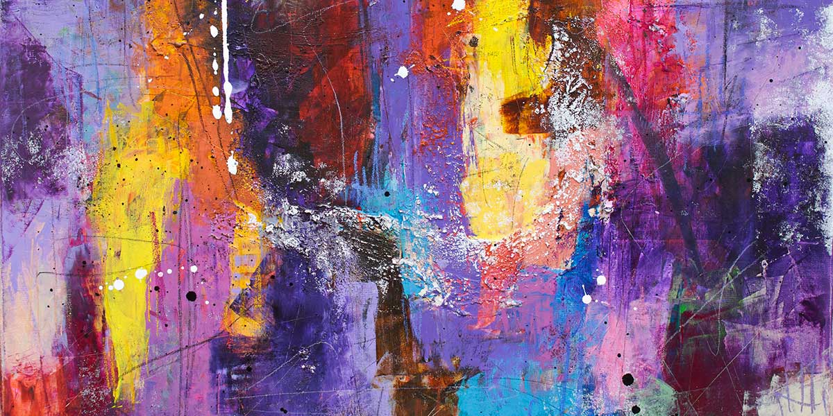 Farvepaletten er domineret af varme, mættede toner: karminrød, signalrød, varm koral, rødorange og dyb vermilion. Disse mødes af store partier i violet, lilla og blomme, som giver dybde og tyngde i kompositionen. Gule og gyldne områder i citrongul og varm okker lyser op mellem de røde felter, mens turkise og blå accenter tilfører kølig kontrast. Hvide sprøjt og lysere slør ligger oven på de mørkere farver og giver rytme og luft, uden at billedet mister sin intensitet.