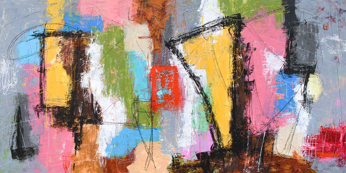 Farveholdningen er lysere og mere afdæmpet end i de mere højenergiske værker, men stadig rig på nuancer. Her mødes kalkhvid, lys grå og støvet blå med blød rosa, varm fersken, sand, honninggul og dæmpet okker. Mørkere partier i sortbrun og dyb umbra giver kontrast og vægt, mens små felter i kølig blå, støvet grøn og rustrød tilfører liv uden at tage over. Det er en palet, der opleves let og rolig på afstand, men som rummer mange små skift tæt på.