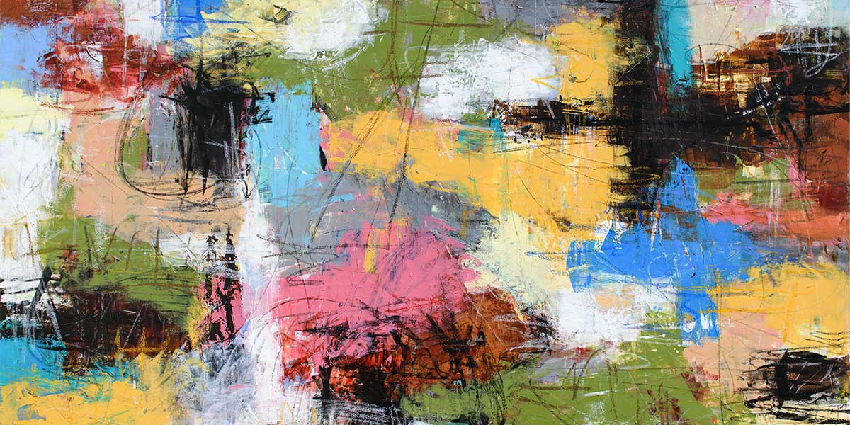 Stort lærredsbillede er opbygget som en energifyldt mosaik af farvefelter, hvor klare kontraster og markante penselstrøg skaber en levende og rytmisk helhed. Kompositionen består af større blokke i olivengrøn, æblegrøn og støvet salvie, som møder felter i klar himmelblå, kobolt og varm citrongul. Mellem disse ligger partier i fersken, pudderrosa og dæmpet terracotta, der binder helheden sammen.
