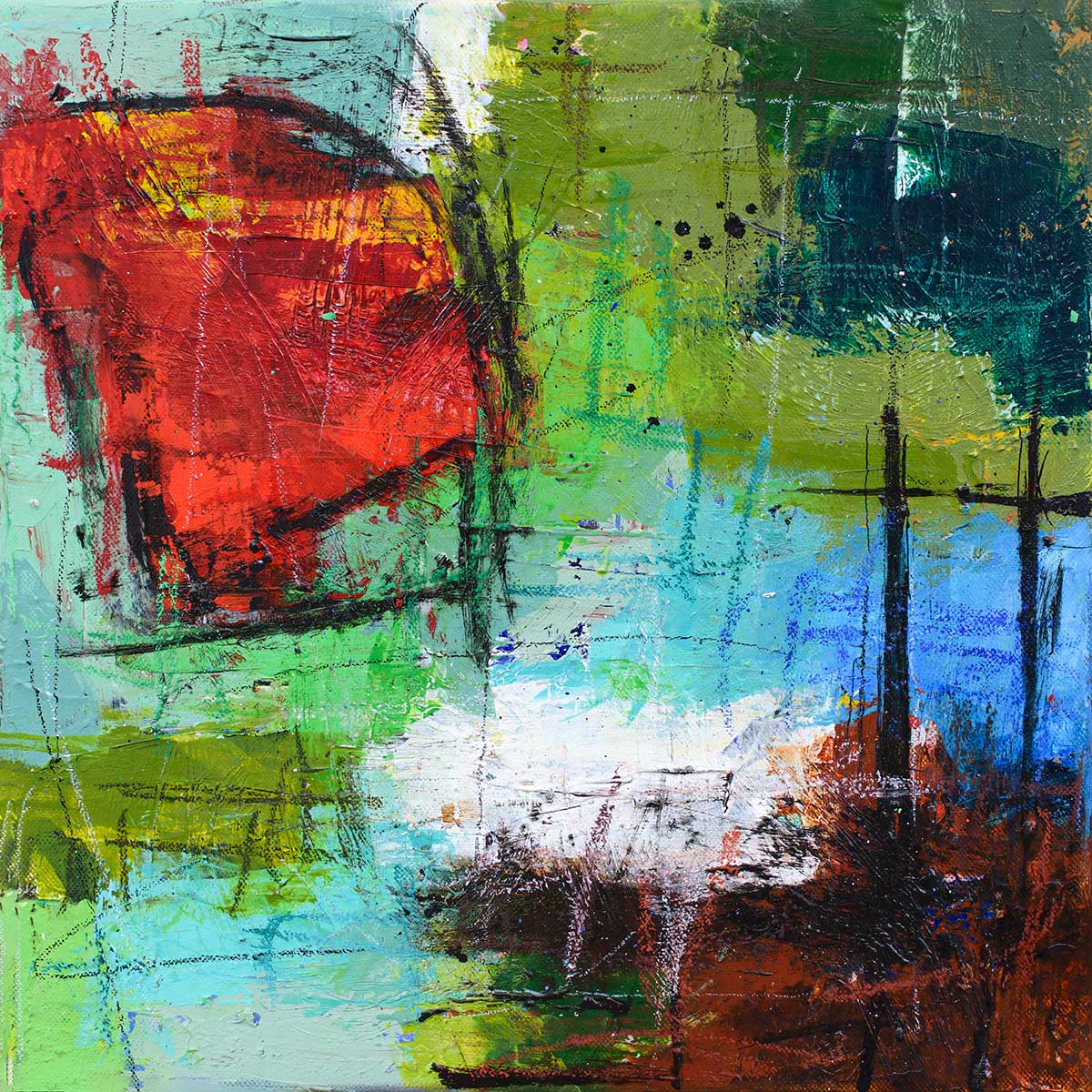 Farverne ligger mellem olivengrøn, støvet grøn, mint, turkis, lys blå, varm rød, rust, brun, creme og hvide partier. De mørke markeringer i sort og dyb brun tilfører tyngde og gør, at de grønne og blå toner får mere modstand. Det er netop mødet mellem de jordede rødlige farver, de grønne felter og de kølige blå nuancer, der giver maleriet sit særpræg og får det til at virke både naturligt og levende.