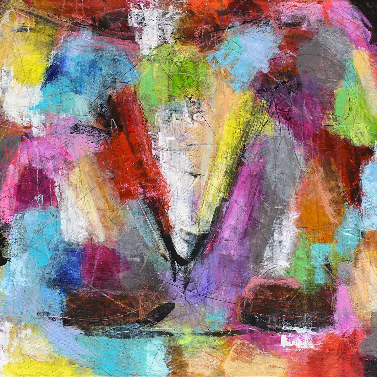 Stort lærredstryk er opbygget omkring et markant, mørkt V-formet penselstrøg, der samler kompositionen og skaber en tydelig visuel akse midt i det farvemættede motiv. Omkring dette centrum folder brede og halvtransparente farvefelter sig ud i lag, hvor hver tone både skjuler og afslører det underliggende arbejde. Det er et motiv med tydelig retning og kraft, men samtidig med en kompleks og sanselig overflade.