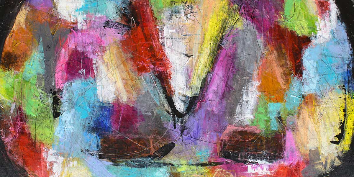 Farverne er stærke, men sat sammen med en nordisk lethed i balancen. Klar himmelblå og støvet cyan møder varme partier i koralrød, rødorange og brændt terracotta. Derudover ses felter i blød limegrøn, lys citrongul, lavendel, violet og mere dæmpet grårosa. De mørkere partier ligger i grafit, sortbrun og dyb umbra, især omkring den centrale V-form og i de tungere felter nederst i kompositionen. Små hvide og kalkede overmalinger ligger som slør over flere områder og giver billedet luft, så farverne får plads til at virke uden at blive kompakte.