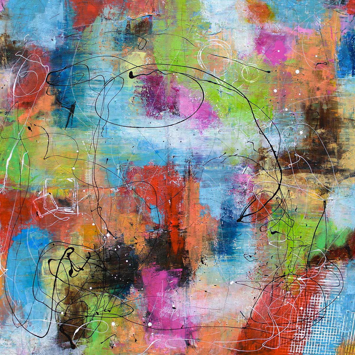 Lærredsbillede moderne kunst er opbygget som en farverig og dynamisk komposition, hvor energiske penselstrøg og grafiske linjer skaber en levende bevægelse på tværs af lærredet. Motivet fremstår spontant og intuitivt med et netværk af sorte og hvide streger, der slynger sig hen over de mange farvefelter og binder kompositionen sammen.