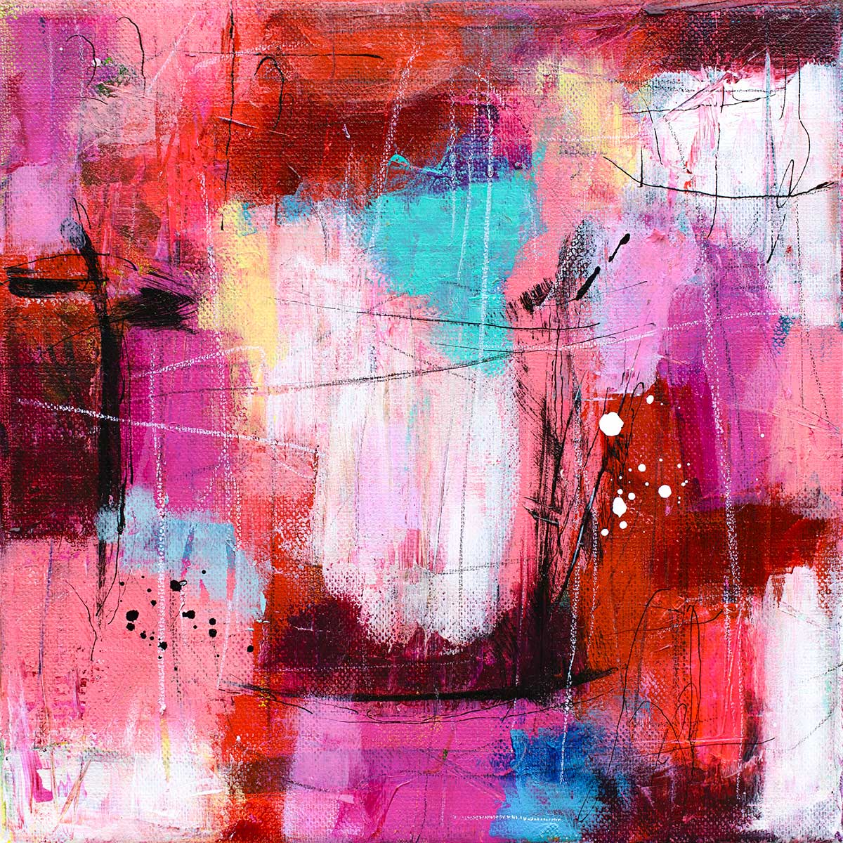 Farverne kredser om pink, magenta, koral, varm rød og dybe rosa toner, som brydes af hvid, lys turkis og små kølige felter i blålige nuancer. De mørkere områder i bordeaux, brun og sort giver tyngde og gør, at de lyse farver ikke flyder ud. Det er netop mødet mellem de varme rosa toner og de kølige turkise felter, der giver maleriet sin energi og får det til at virke både lyst og markant.