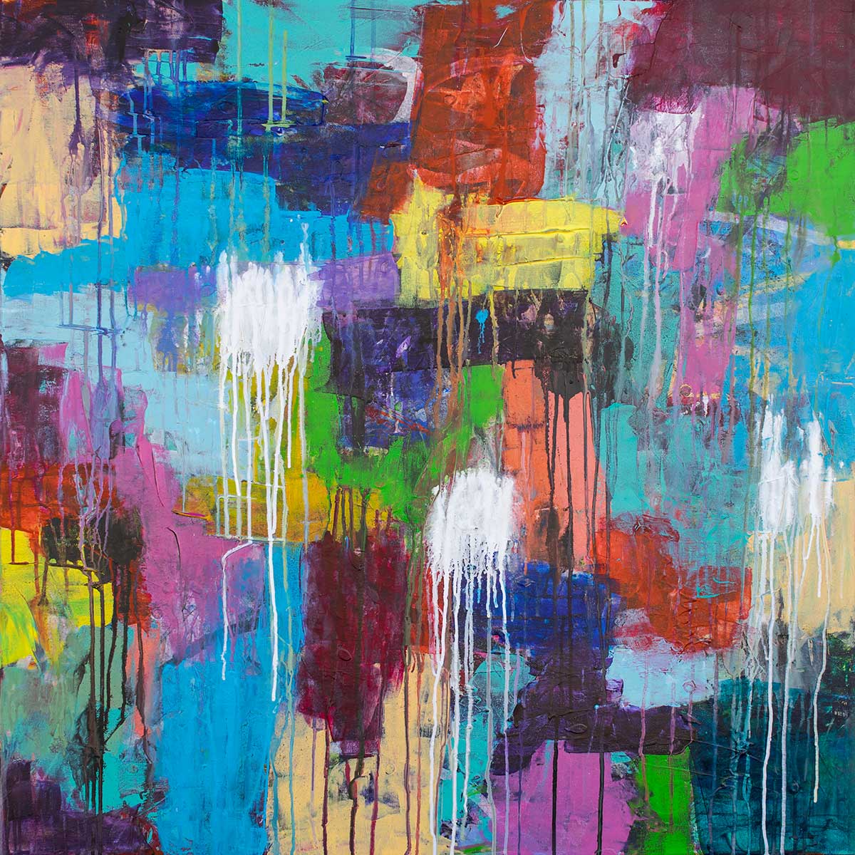 Paletten bevæger sig mellem klar turkis, lys cyan og kølig petrol, som mødes af violette, magenta og pink felter i både transparente og mere dækkende lag. Indimellem ligger stærke partier i limegrøn, citrongul, orange og varm koral som lysende kontraster, mens mørke områder i blomme, marineblå og sort giver værket bund og forankring. De hvide dryp og lyse slør skærer sig ned gennem fladen og trækker motivet op i lyset, så det ikke lukker sig om sig selv.