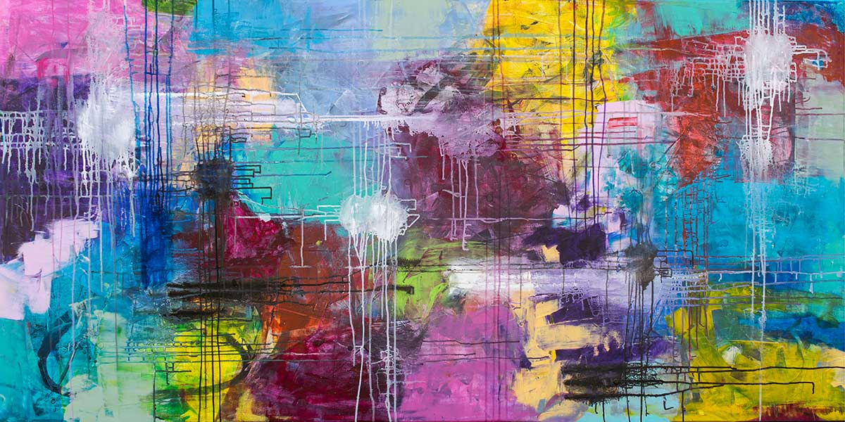 Stort maleri til stuen fremstår som en bred og energisk komposition, hvor klare farvefelter, lodrette dryp og lineære spor skaber et motiv med høj puls og tydelig retning. Det vandrette format gør, at billedet naturligt breder sig ud over væggen og samler større flader på en rolig måde, selv om udtrykket er intenst. På afstand læses det som en stærk helhed med meget bevægelse, men også med en klar kompositorisk kontrol.