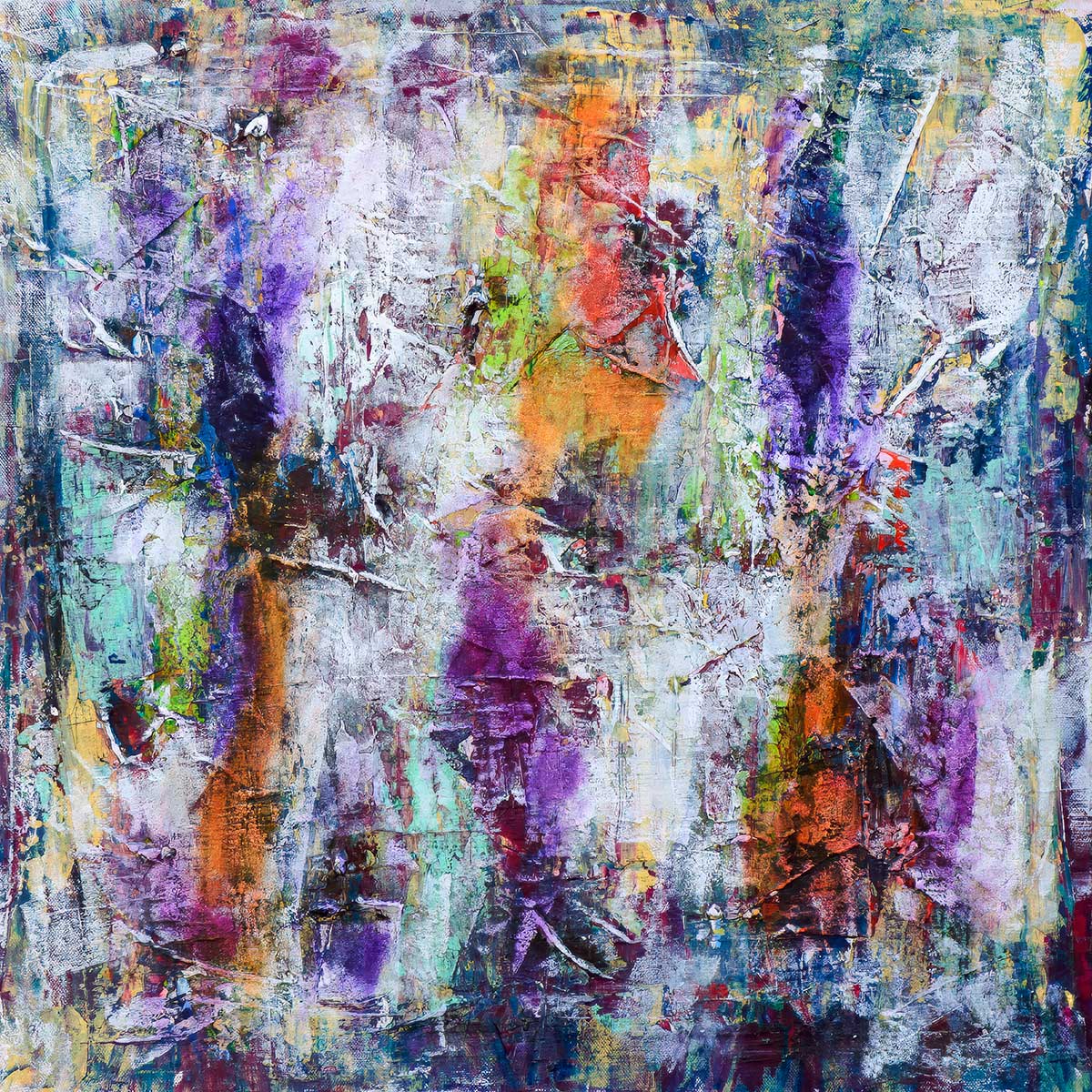 Stort lærredsprint fremstår som et stemningsmættet motiv, hvor lag-på-lag-teknikken skaber en dyb og næsten tåget rumfornemmelse. Kompositionen er opbygget med lodrette bevægelser og transparente overgange, som kan minde om figurer i bevægelse eller silhuetter opløst i lys. Overfladen er præget af skrab, overmalinger og strukturelle spor, der giver værket en sanselig og levende karakter.
