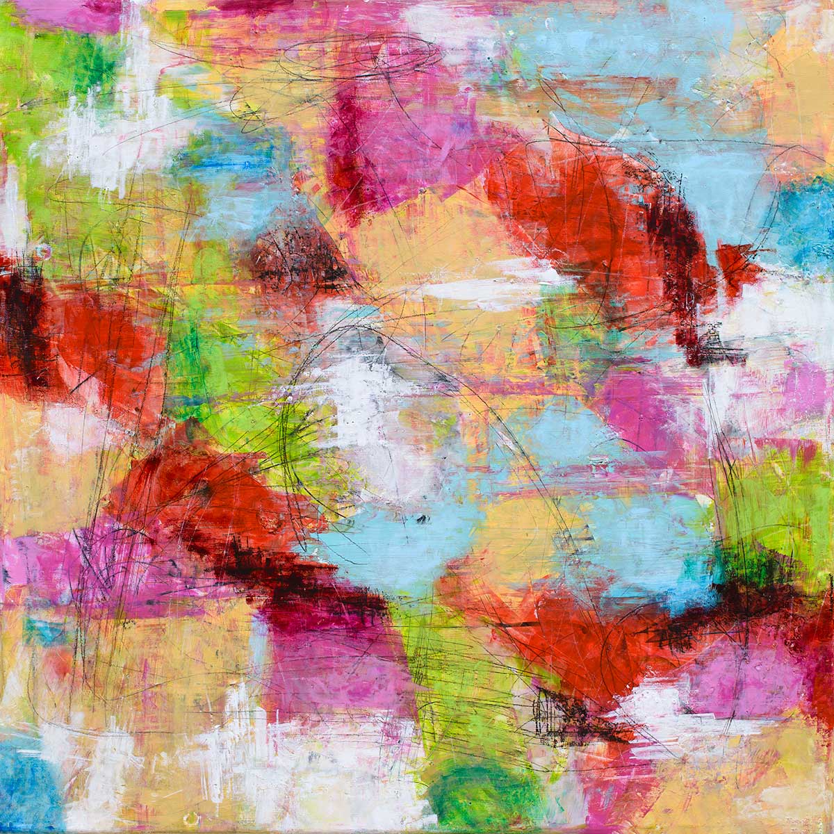 Stort lærredsbillede abstrakt er præget af en intens og ekspressiv farveopbygning, hvor kraftige lag og brede strøg danner en tæt og sanselig flade. Kompositionen er centreret omkring varme toner i karminrød, signalrød og dyb kirsebær, som dominerer store dele af lærredet. Disse brydes af markante felter i limegrøn, citrongul og æblegrøn samt kølige indslag i turkis og klar himmelblå.