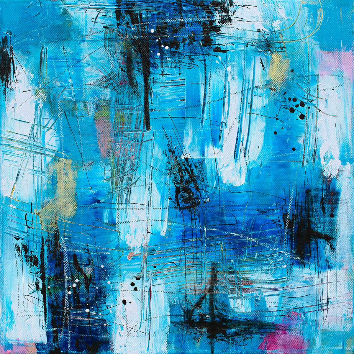 Farverne samler sig omkring turkis, cyan, himmelblå, dybere blå og kølige hvide toner, som brydes af sort, mørk marine og enkelte små felter i beige, rosa og violette nuancer. De mørke spor giver billedet kant og holder de lyse blå områder fast, så motivet ikke bliver for let. Det giver maleriet en fin spænding mellem noget åbent og noget mere markeret, og det er med til at skabe ro uden at gøre udtrykket stille.