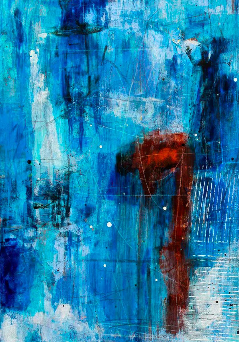 Blåt canvas billede fremstår som en dyb og atmosfærisk komposition, hvor kølige blå lag bygger et næsten meditativt rum op omkring nogle få, varme modspil. Motivet er overvejende vertikalt i sit flow, med lange, transparente strøg og glidende overgange, der skaber en fornemmelse af dybde som i vand, tåge eller reflekteret lys. Kompositionen virker rolig ved første blik, men ved nærmere betragtning træder små mørke markeringer, skrab og lyse spor frem og giver billedet en fin indre bevægelse. Et varmt, rustrødt felt i højre side fungerer som modvægt til de kølige blå toner og skaber et elegant spændingspunkt.