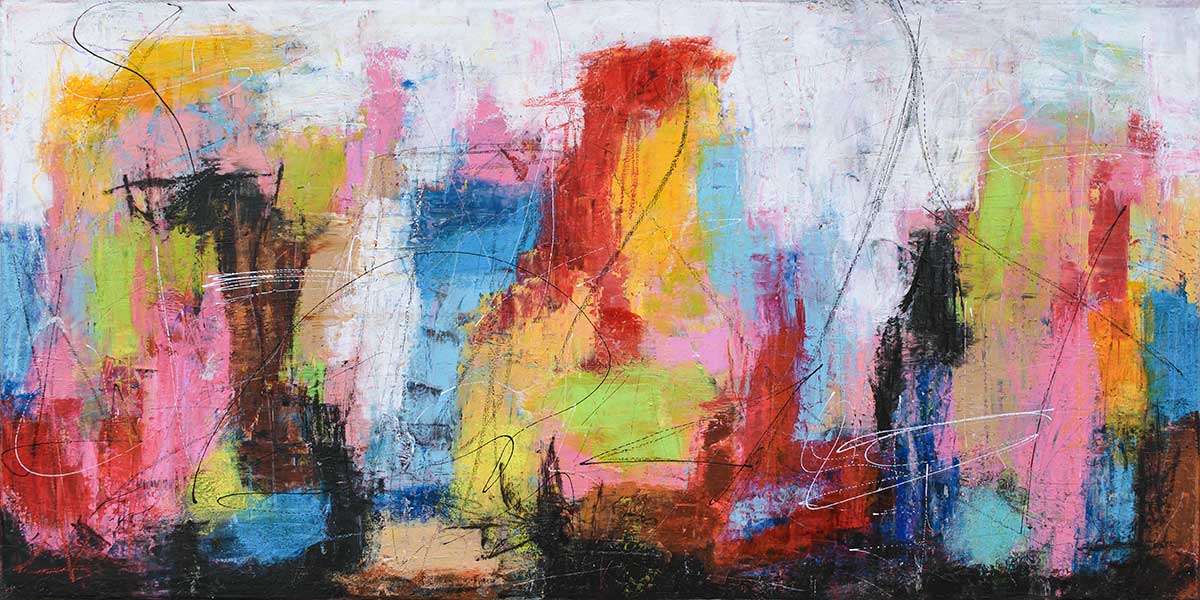 Abstrakt maleri kunst fremstår som en lys og farverig komposition, hvor større felter, mørke markeringer og fine lineære spor skaber et motiv med både åbenhed og kraft. Det samlede udtryk virker umiddelbart levende og energisk, men billedet holdes fast af de mørke partier, som giver helheden dybde og rytme. På afstand står værket klart og samlet, mens de mange overgange og lag bliver mere tydelige tæt på.