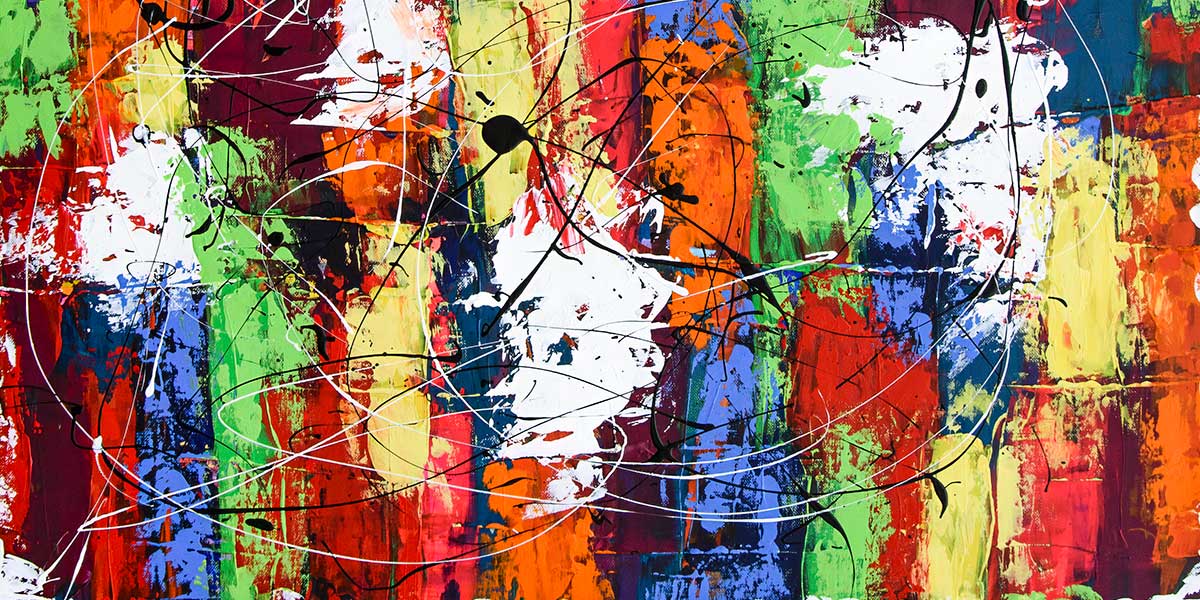 Stort lærredsbillede med farver er et kraftfuldt og ekspressivt motiv, hvor brede, horisontale farvefelter danner en rytmisk bund. Oven på disse ligger energiske, slyngede streger i sort og hvid, som skaber bevægelse og kontrast. Lagene ligger tydeligt oven på hinanden og giver værket en markant, fysisk karakter.