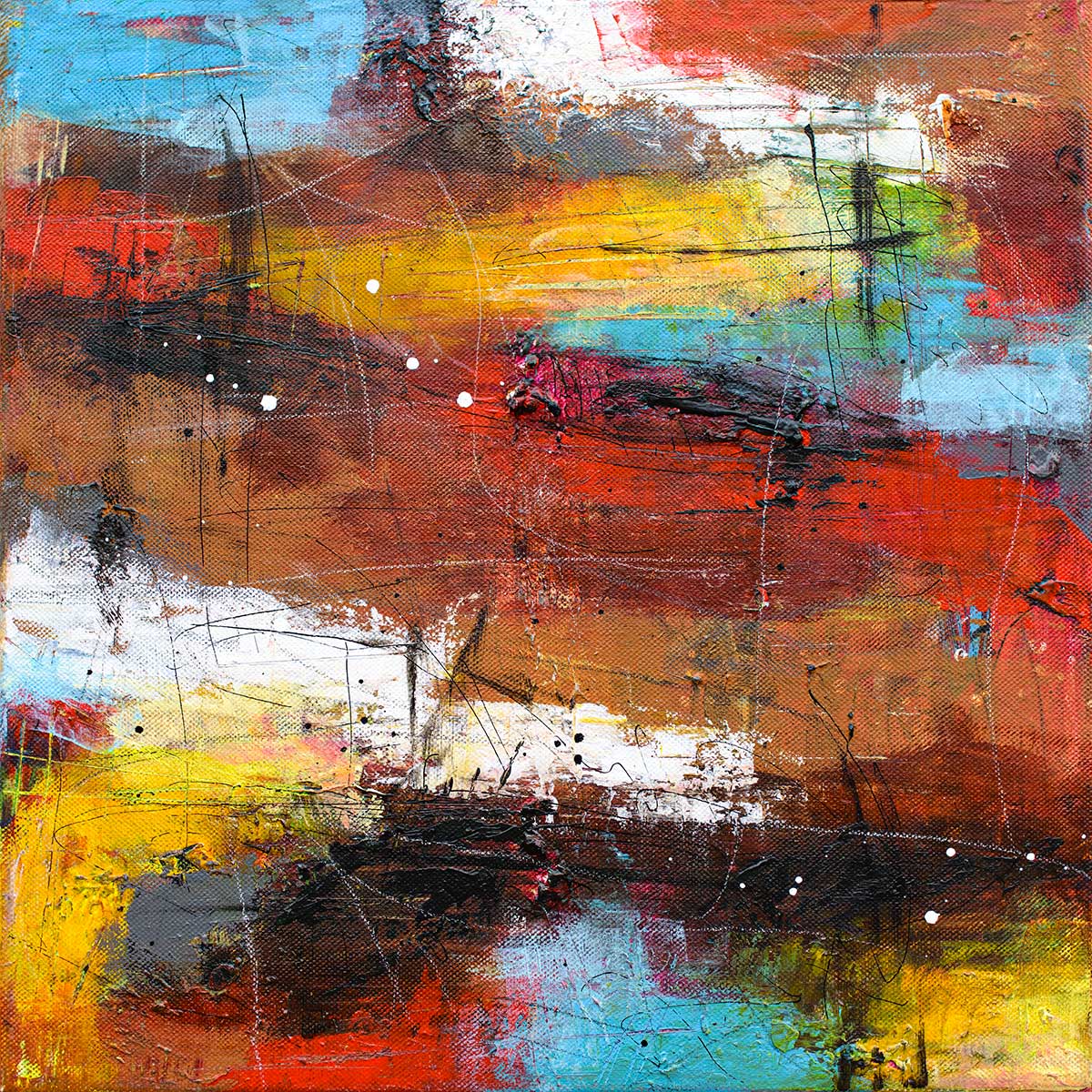 Farverne bevæger sig mellem brændt orange, rust, kobber, okker og varme jordtoner, som brydes af turkis, lys blå, hvid og enkelte mere syrlige gule partier. De mørke felter i sort og dyb brun giver motivet modstand og gør, at de varme farver ikke flyder ud. Samspillet mellem de glødende rødlige toner og de køligere blå områder giver billedet en stærk spænding, som holder øjet i bevægelse uden at gøre udtrykket uroligt.